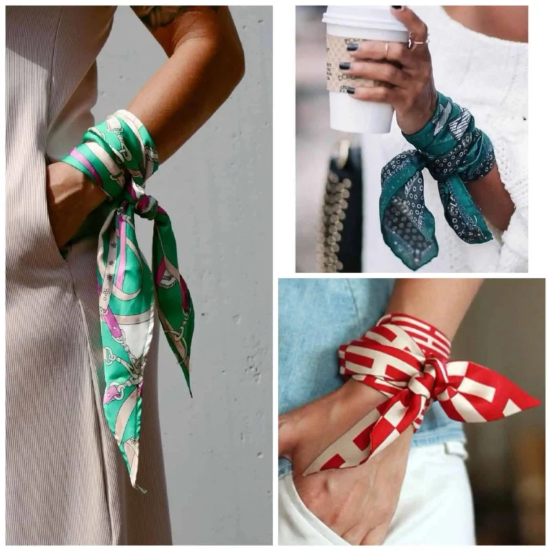 Wrap a thin scarf around your wrist like a bracelet.Adds a delicate and feminine touch to any outfit.