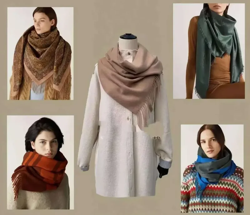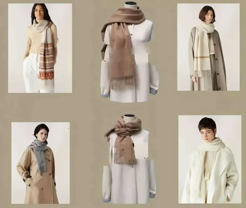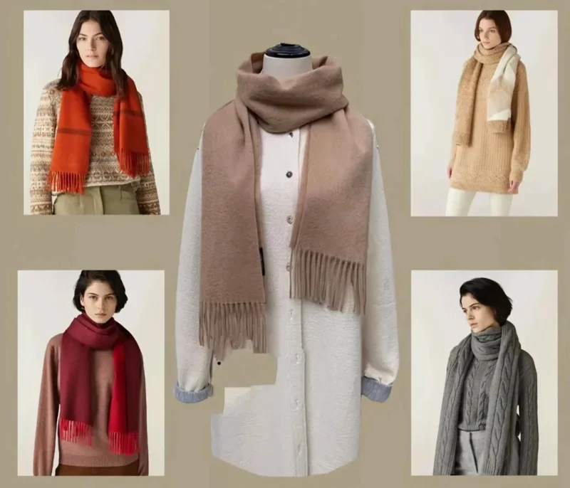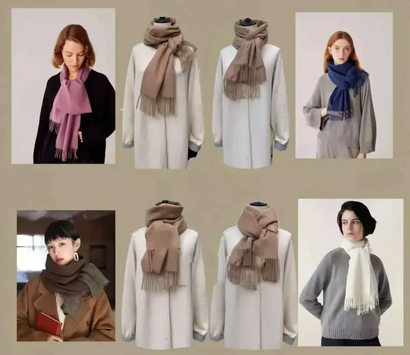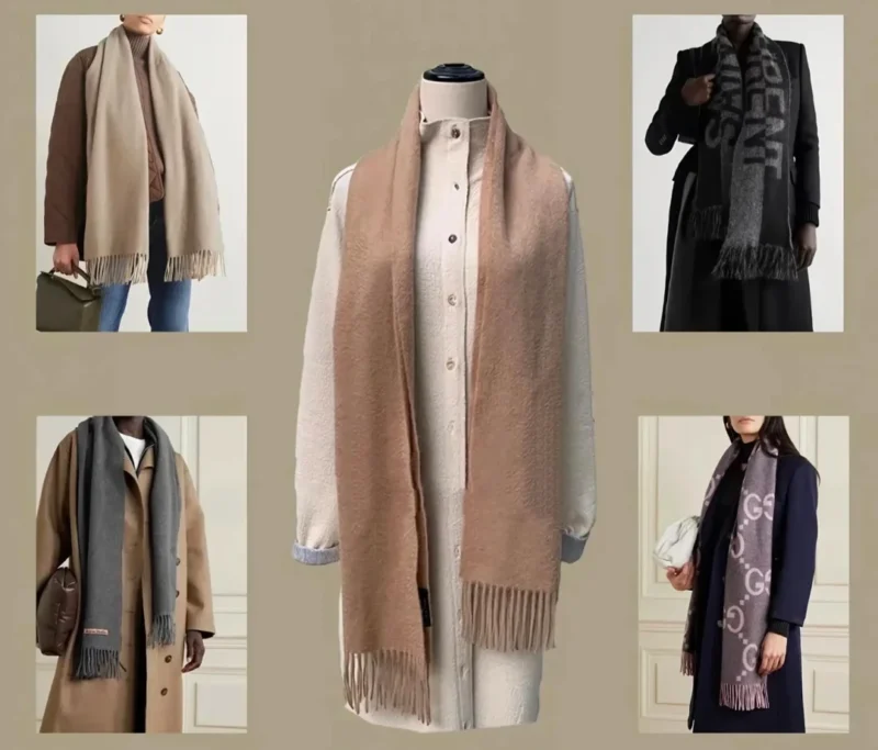This method creates a minimalist yet sophisticated look, highlighting the scarf’s soft drape and adding a cozy winter vibe.