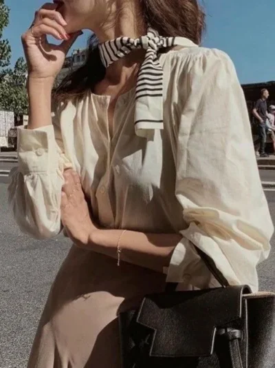 Pair a cream satin blouse with a matching flowing silk scarf.