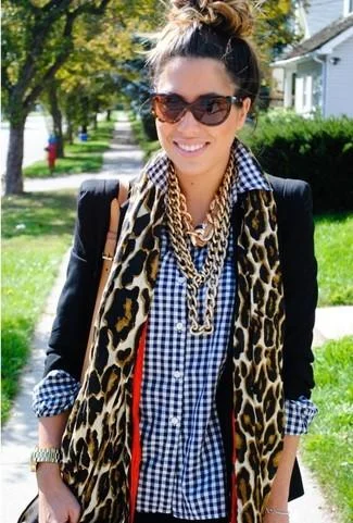 A black suit styled with a leopard print silk scarf strikes the perfect balance between sensual and cool.
