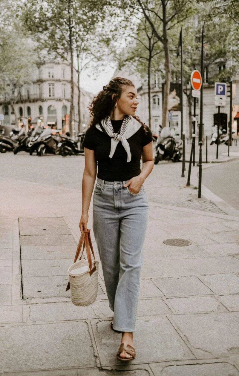 Fold the scarf into a strip and tie a loose bow around your neck, letting the ends fall naturally.Pair it with a white T-shirt and wide-leg jeans for that effortless South of France holiday vibe—fresh, flattering, and youthful.
