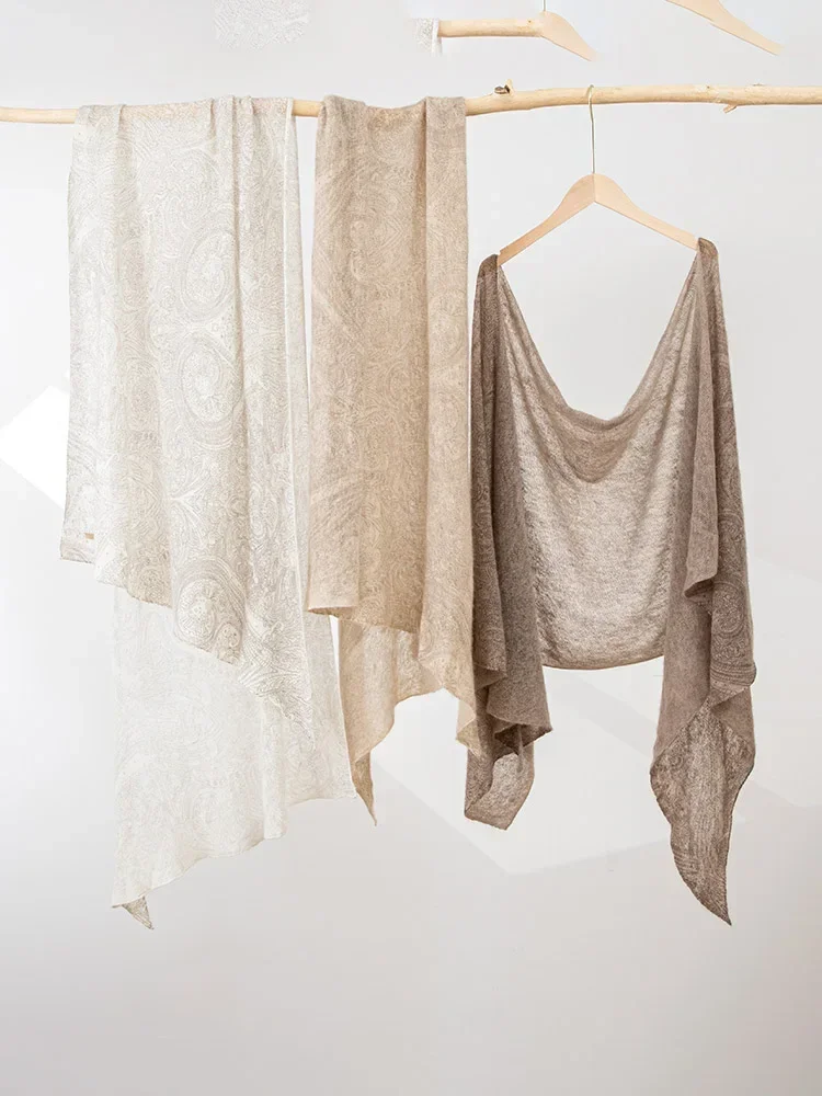 This product is made with 100% baby cashmere, worsted fine yarn, and is printed with eco-friendly dyes. Please note that this item is not rectangle, but slightly closer to a quads.